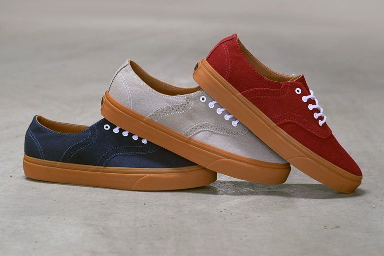 Pour la saison à venir, automne/hiver 2015, le modèle sera proposé chez Vans California. Plusieurs versions sont prévues et le modèle a d’ailleurs été retravaillé dans un style « Decon » (pour Deconstruct, il n’y plus de renforts à l’intérieur, le rendu est bien plus sobre). On a d’ailleurs l’habitude de voir du Decon chez Vans California et plus précisément sur le modèle Authentic. La Vans Spectator partage d’ailleurs la même silhouette que cette dernière mais avec quelques détails plus sophistiqués. Le principal ajout réside dans cet empiècement central en cuir suédé qui arbore des perforations façon chaussures brogue. Trois coloris sortiront cet été : bleu marine (dress blues), gris clair (aluminium) et bordeaux (biking red). Chaque paire est finie avec une semelle entièrement gomme. Les lacets sont ronds et blancs pour aller avec les œillets. Le rendu est plutôt élégant.