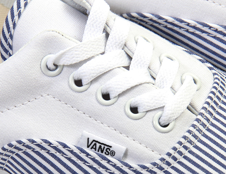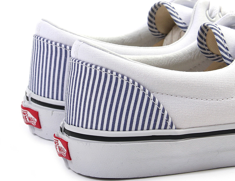Entièrement faite de toile, cette Vans Era « Deck Club » dispose d’un imprimé à rayures présent à différents endroits de la sneaker. En effet, on retrouve ce traitement « pinstripe » au niveau du renfort au talon, sur la partie avant de la paire ainsi que sur le revers de la languette pour un rendu assez élégant. Le surnom « Deck Club » ne trompe pas et la paire a été sûrement désignée en pensant au nautisme, ou à la voile, et les tenues qui vont avec.