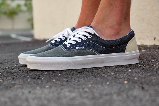 Cette Vans Era fait partie du pack « Mixed Materials » composé de deux Slip-On et de deux Era. Ce modèle allie trois coloris de toile denim : gris, bleu marine et crème. Vans propose une paire originale, utilisant des matériaux rarement vus sur une sneaker, pour sa collection automne 2014. Cette Vans Era Denim Mix est dès à présent en vente sur notre boutique en ligne.