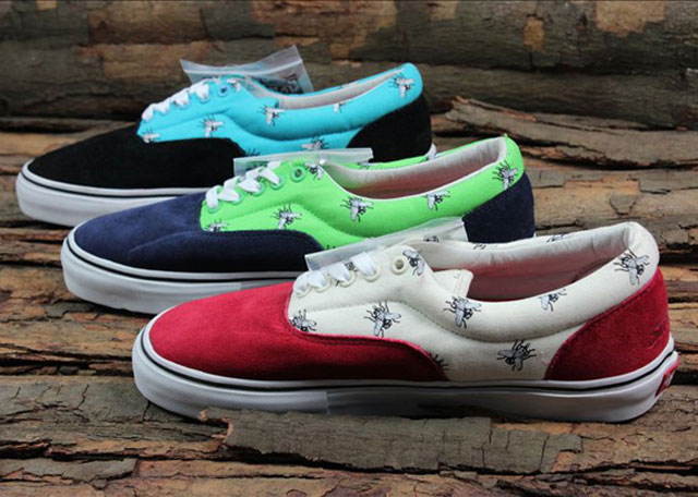 On découvre depuis quelques semaines de nouvelles paires estampillées Supreme qui sont dévoilées par des sites asiatiques sans pour autant que la marque communique officiellement dessus (voir Nike Supreme Fragment). Aujourd’hui c’est un pack de trois Vans era bicolores avec pour motifs des mouches et le logo Supreme retravaillé au niveau du talon.