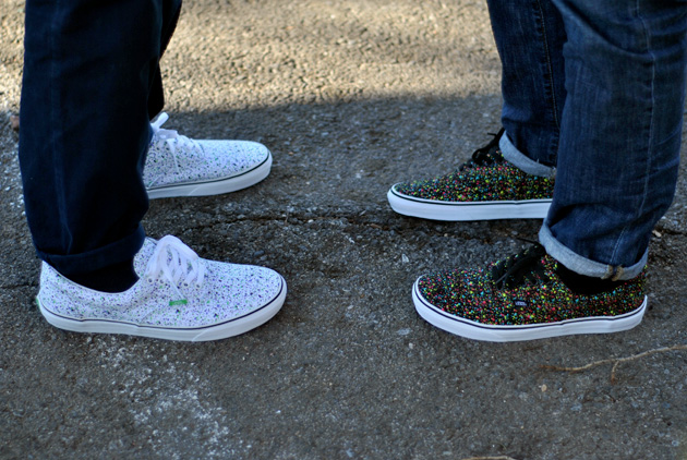 Les marques XLarge et Supreme avaient déjà travaillé ce type de motif ‘overspray’ (tâches de peinture) sur des collabs. Cette fois-ci ce sont deux paires de la collection Vans pour le printemps qui ont une toile tâchetée. La première est noire avec des petites tâches rose/jaune/jaune alors que la seconde est en toile blanche avec un motif vert/noir/violet.