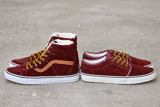 L’hiver s’installe peu à peu et les températures ont déjà bien baissé. Vans a trouvé la solution pour maintenir les pieds au chaud avec ces deux modèles fourrés. La partie en daim bordeaux a été traitée avec Scotchgard pour les imperméabiliser.