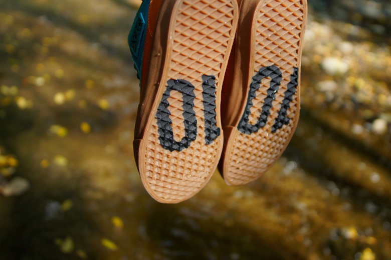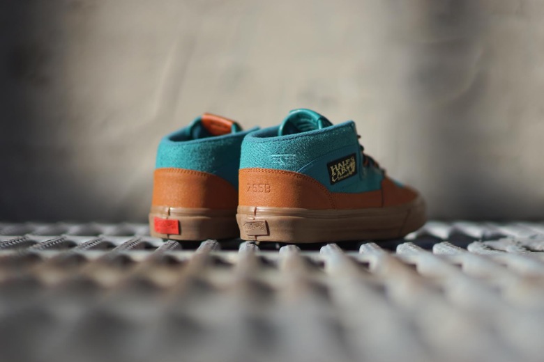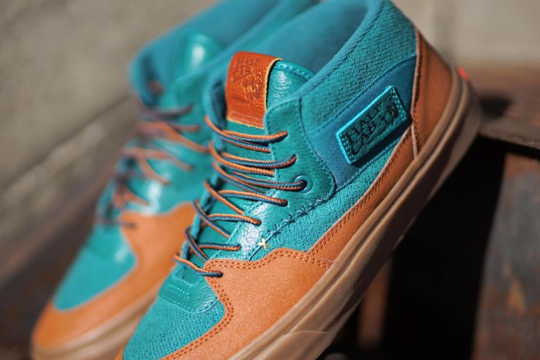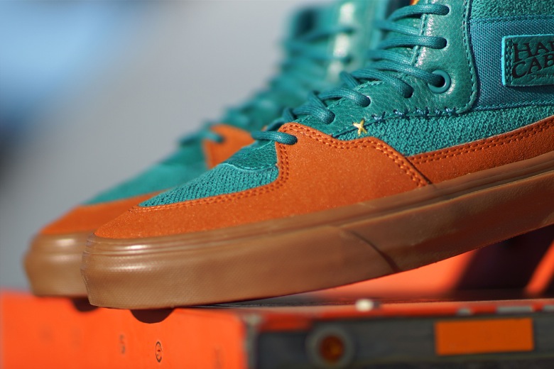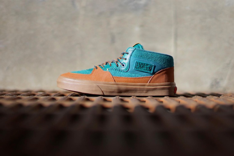 L’ensemble des choix pour cette association s’appuie sur la célébration de cette décennie passée et du thème du changement de saisons que l’on rencontre dans cette région des États-Unis. Cette Vans Half Cab recevra un traitement tout à fait inédit avec plusieurs types de matériaux allant du cuir grainé, à la toile, en passant par ce revêtement en sweat retourné. Le contraste entre le bleu turquoise du haut de la paire et le marron allant jusqu’à la semelle gomme représente donc ce décalage entre les saisons chaudes et froides.