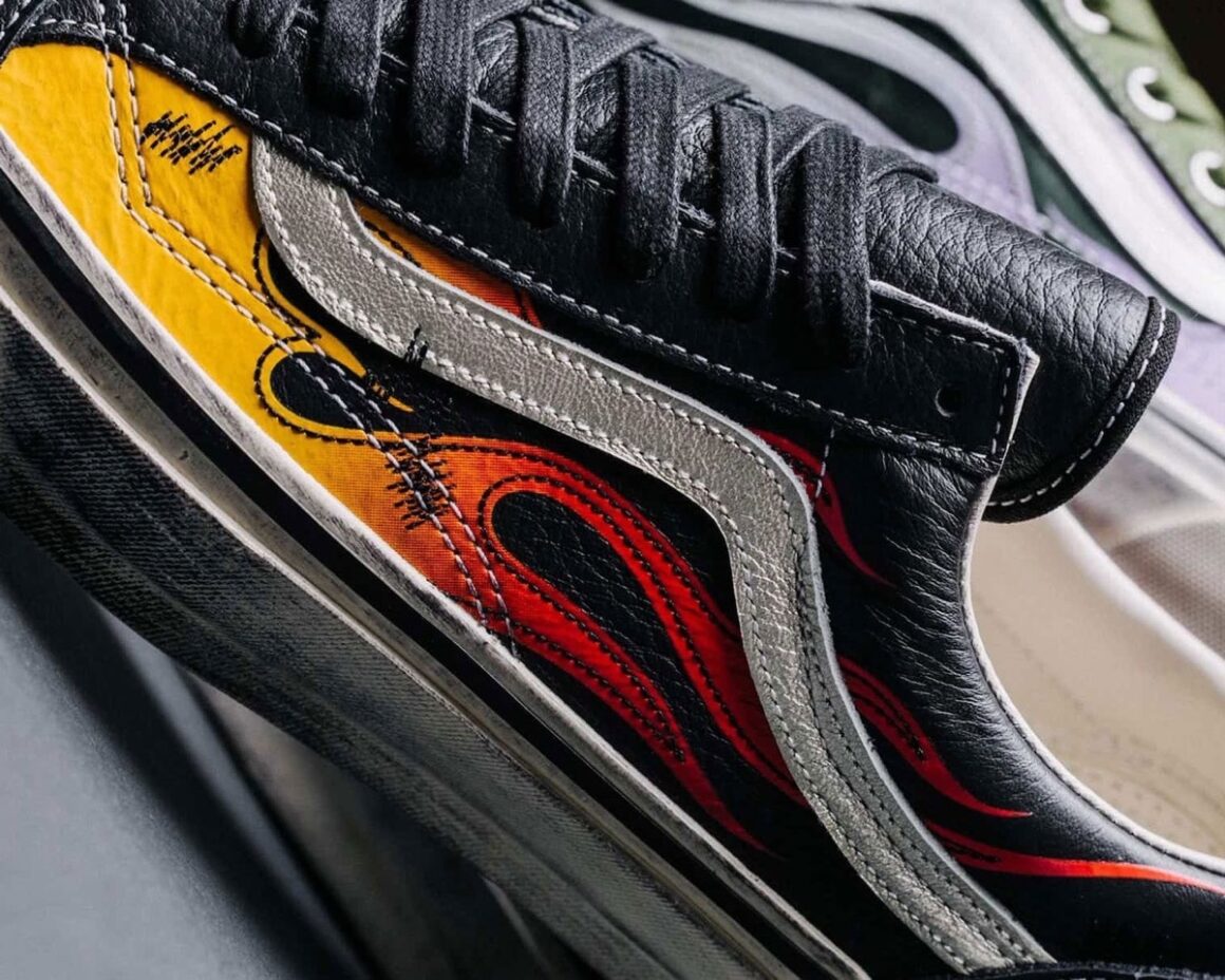 Les trois paires du pack reposent sur la Vans Old Skool, modèle lancé dans les années 70 et reconnaissable à sa fameuse Sidestripe sur le côté. La construction reste identique à la version traditionnelle, avec une tige en toile ou en cuir, un col rembourré pour le maintien et la semelle extérieure gaufrée en caoutchouc, signature technique de la marque. Le motif Flame apparaît sur les panneaux latéraux, avec un dégradé de couleurs qui rappelle les versions originales. Ce type d’imprimé est devenu culte chez Vans, car il mélange l’esthétique skate, punk et custom automobile, des influences très présentes dans l’histoire de la marque.