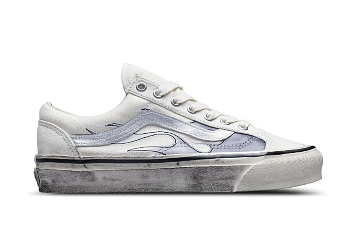 Le troisième coloris se distingue avec une base claire mêlant toile blanche et flammes bleu marine, donnant à la chaussure un aspect volontairement usé et rétro. Le motif Flame reste présent sur les côtés avec un dégradé froid, rappelant certaines rééditions inspirées des archives Vans, avec des couleurs moins saturées et un effet ultra vieilli. Le résultat est une Old Skool au style très nostalgique, qui complète le pack avec une alternative très originale.