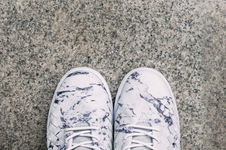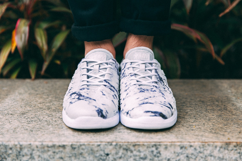 Alors que Vans aurait pu sortir un coloris monochrome, assez en vogue en ce moment, les designers de la marque ont choisi d’appliquer un imprimé imitant l’effet du marbre sur un cuir blanc.