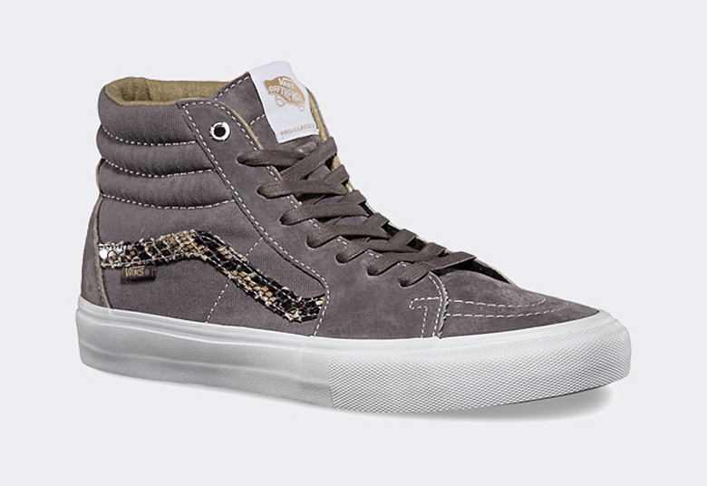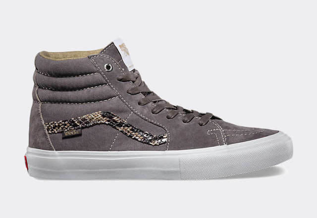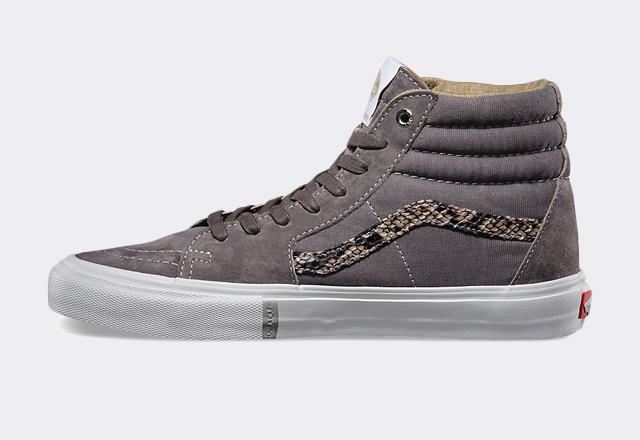 Il est assez rare de voir l’utilisation de matériaux tels que le snakeskin (fausse peau de serpent) pour la gamme skate de Vans. C’est sur une paire de Sk8-Hi que l’on retrouve cette saison ce revêtement au niveau du ‘jazz stripe’. Le reste de la sneaker est faite de canvas et de cuir suédé. Découvrez plus d’images de cette Vans Sk8-Hi Pro ‘Snakeskin’ dans la suite de cette news.