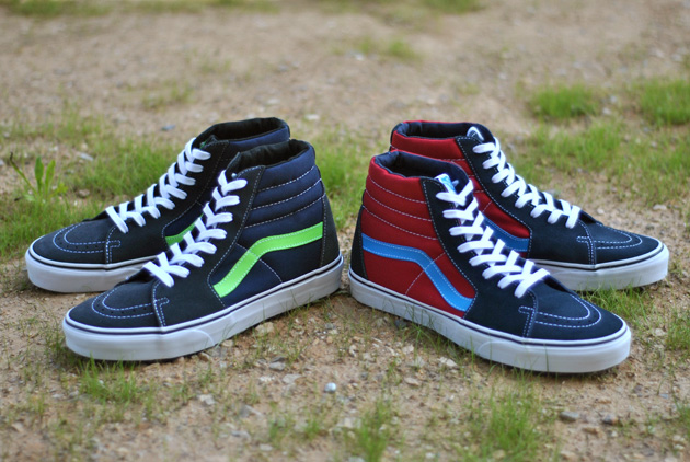 Vans propose de nouveaux coloris sur sa Vans SK8 Hi pour la collection de l’été. Les deux paires sont en toile avec du cuir suédé, un combo proche de ce qui se faisait sur les paires de l’époque. La première est bleu marine avec sa stripe verte et du cuir suédé gris foncé. La seconde combine du cuir suédé bleu marine avec une toile rouge et sa stripe est bleu clair.