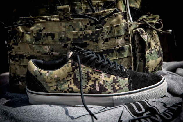DEFCON a travaillé avec Vans Syndicate pour créer des des Vans Old Skool ainsi que des Vans Sk8-Hi (la Notchback S) dans des versions militaires. Les paires sont habillées avec un camouflage bien spécifique, le ‘Navel Special Warfare AOR1 and AOR2 camo’. La Sk8-Hi a été renforcée à l’avant avec un matériau ininflammable et sa languette est épaissie. C’est le même type de traitement qui a été appliqué sur la Old Skool S mais dans différentes couleurs. Chaque paire possède un traitement de sa doublure intérieure en Dri-Lex™ qui permet un séchage plus rapide et une bonne ventilation.