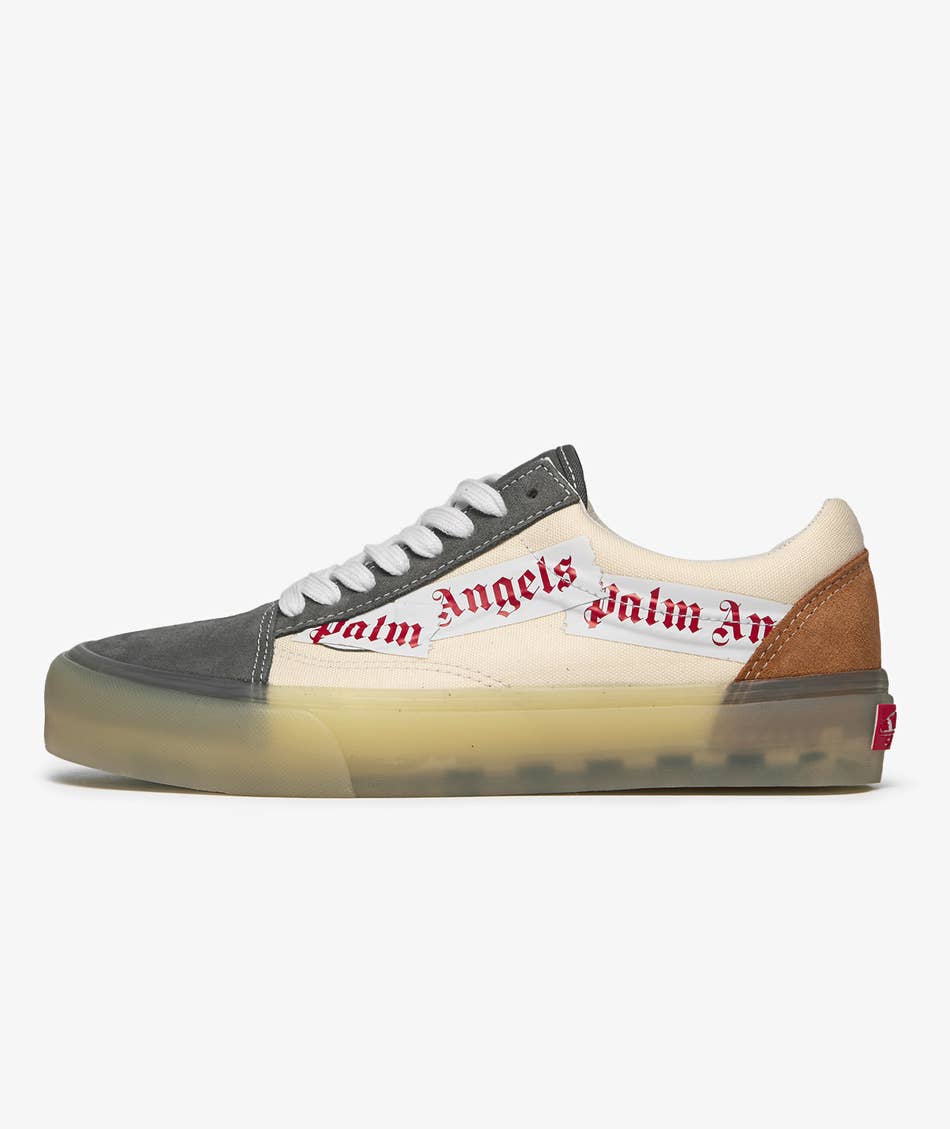 La dernière paire du pack Vans Vault x Palm Angels est une Old Skool. La base en canvas crème est relevée par une languette en canvas grise. Ce gris se retrouve sur le cuir suédé utilisé sur la toebox et les passages de lacets. Les logos Palm Angels se superposent à la classique vague latérale. Le talon camel et la semelle sont repris des deux autres modèles. Les paires viennent accompagnés de lacets ronds supplémentaires et de billes en bois pour les personnaliser ainsi qu’une boîte spéciale.