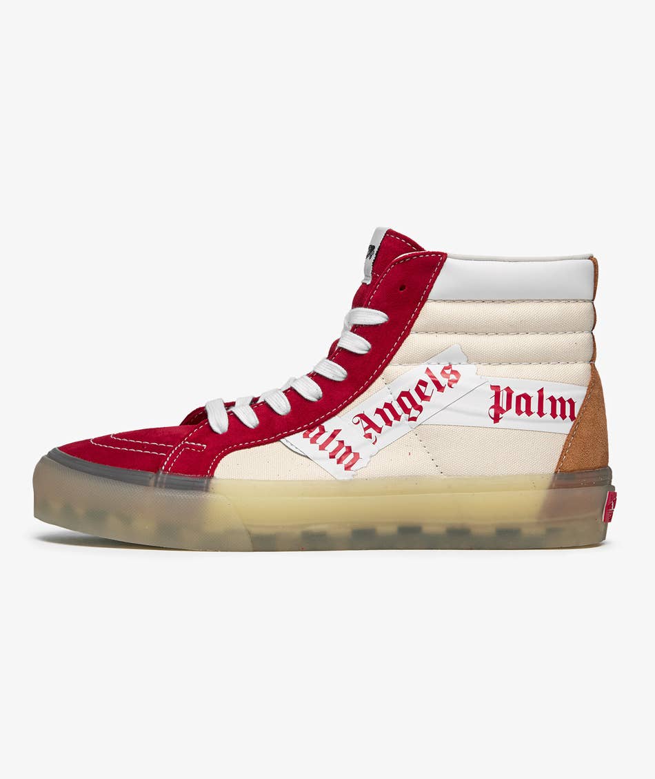 La collection Vans Vault x Palm Angels s’ouvre sur la classique Sk8-Hi. Revisitée par Palm Angels, elle se pare d’une base en canvas crème, visible sur les panneaux latéraux. La toebox, les passages de lacets et la languette sont en cuir suédé rouge, laissant apparaître des coutures blanches. Ces dernières s’accordent aux lacets et à l’étiquette au sommet de la languette. Les panneaux latéraux sont traversés de patchs thermocollés, ornés du logo Palm Angels en rouge. Le talon est en cuir suédé camel, et surmonte un cartouche Vans rouge. Il est embossé sur la semelle intermédiaire, dont le traitement translucide apporte une touche de modernité au classique de Vans.