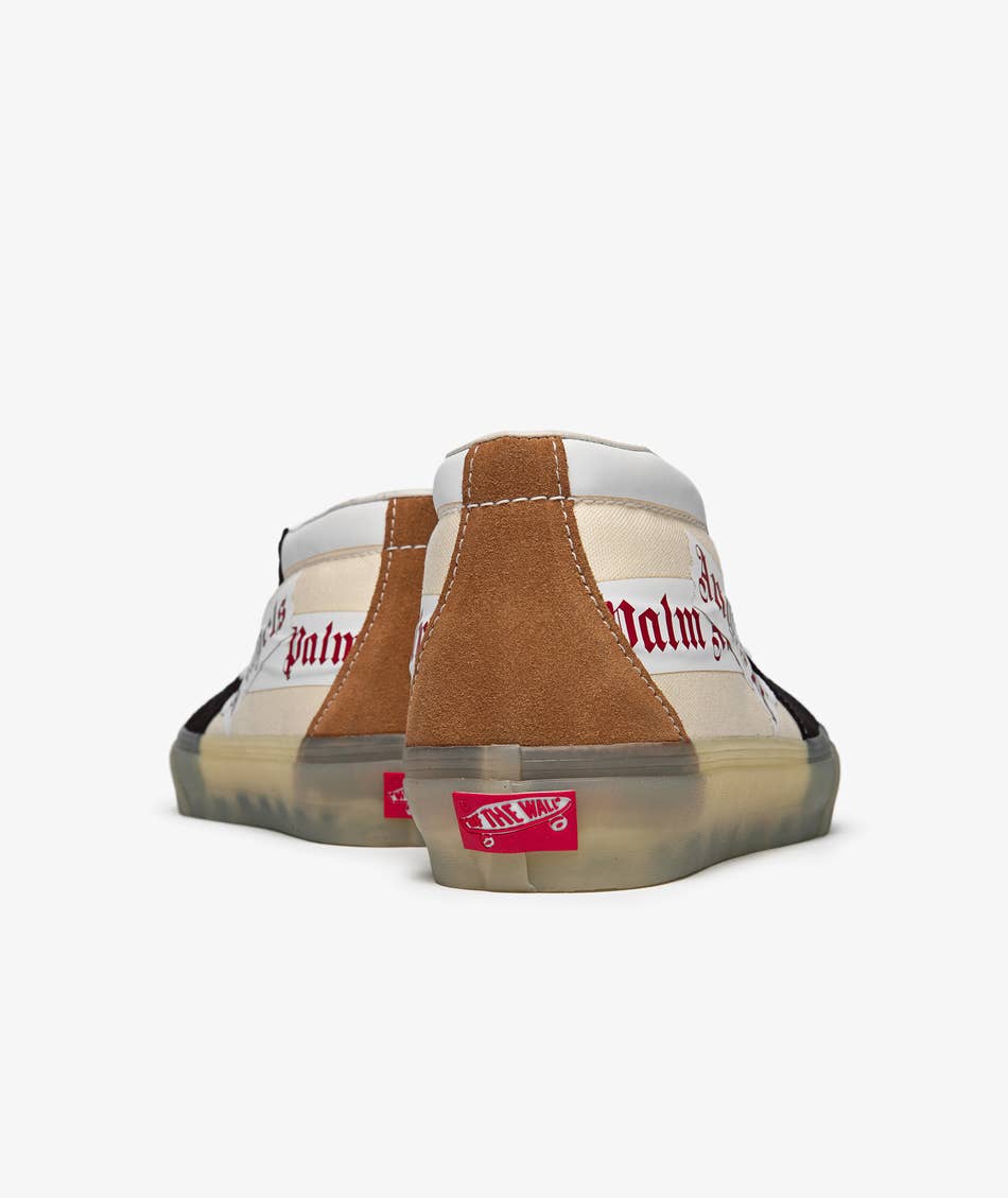 La Vans Vault x Palm Angels Sk8-Mid reprend une construction similaire à la version haute. La silhouette semi-montante est sublimée par du cuir suédé noir sur la toebox, les passages de lacets et la languette. La talon camel apporte du contraste au rouge des logos Palm Angels. La semelle translucide enferme un motif damier en guise de semelle extérieure.