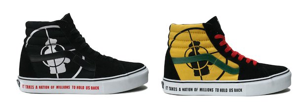 Supreme s’associe au mythique groupe Public Enemy pour sortir plusieurs paires de Vans. Les boites et les paires ont été créées en utilisant l’univers du groupe.