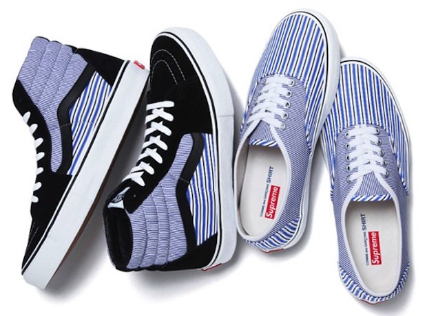 Les deux marques de skate, Vans et Supreme, travaillent ensemble depuis plus de 15 ans. La toute première collaboration remonte à 1996, deux ans après la création de la marque de skate new-yorkaise. Depuis le début des années 2000, Supreme crée chaque année au moins une nouvelle collection avec Vans.