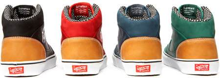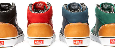La tant attendue collaboration entre Vans et Supreme sera disponible dans les shops américains Supreme à partir du 4 décembre, le 6 dans les shops japonais et le 8 sur leur site web. 4 Old Skool et 4 Moutain Edition sont déclinées en bleu, rouge, noir et vert.