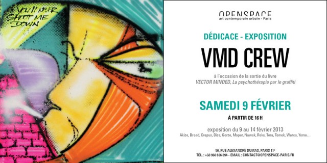 Le crew VMD (Vector Minded) a été fondé au début des années 90 en région parisienne par l’artiste Dize. Aussi bien multi-générationnel que pluridisciplinaire, les VMD sont aujourd’hui composés d’une quarantaine d’artistes âgés de 20 à 40 ans pratiquant le dessin, la peinture, le graphisme, la sculpture ou encore la musique. Après un premier livre sorti en 2010 – Vector Minded (Teach Yourself, the Way of Living) – le groupe réitère avec un nouvel opus à paraître aux éditions Matagot. Composé de centaines de photos exclusives, ce nouveau livre propose une vision intimiste, empreinte de passion avec dessins, tags, graffs, lifestyle.Une Dédicace ainsi qu’un vernissage avec Akize, Bread, Crepus, Dize, Gorze, Moper, Nawak, Reks, Tera, Tomek, Warcs, Yome… sont organisés le samedi 9 février de 16h à 20h